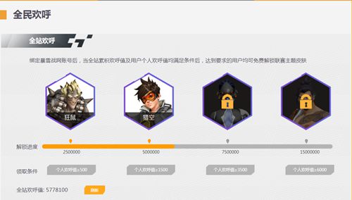 另外目前OWL观赛活动才上线一周,网易CC直播就已经达到了268万的欢呼值,迅速解锁了狂鼠、猎空两款限定联赛主题皮肤!这可是只能在观赛活动中获得的稀有皮肤,国内的观众不用再羡慕国外玩家的皮肤了!不用花钱,只要绑定自己的战网,每日签到后个人欢呼值达到500点就可以把狂鼠和猎空皮肤抱回家了!